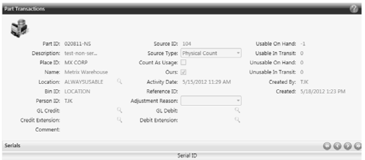 - If you want to verify the variances that were posted, view the Part Transactions screen. Enter the stock count run ID in the Source ID field to search on your stock count.
